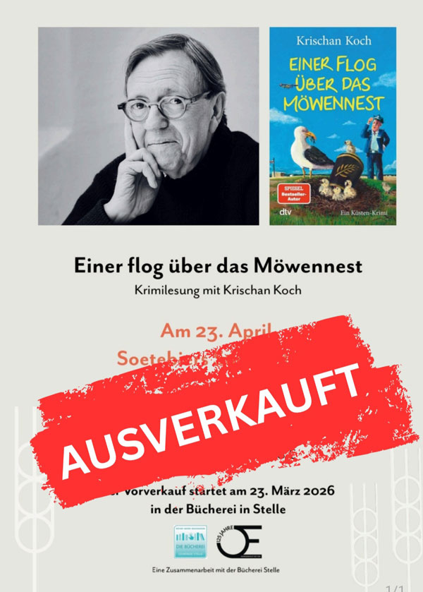 Am 23. April ist Krischan Koch wieder in Stelle zu Gast. Gemeinsam mit der Dorfbäckerei Soetebier und dem Büchereiverein „Bücher und so… Freunde der Bücherei Stelle“ e.V. laden wir zu einem kurzweiligen Abend in die Steller Soetebier-Filiale, Harburger Str. 33 ein.